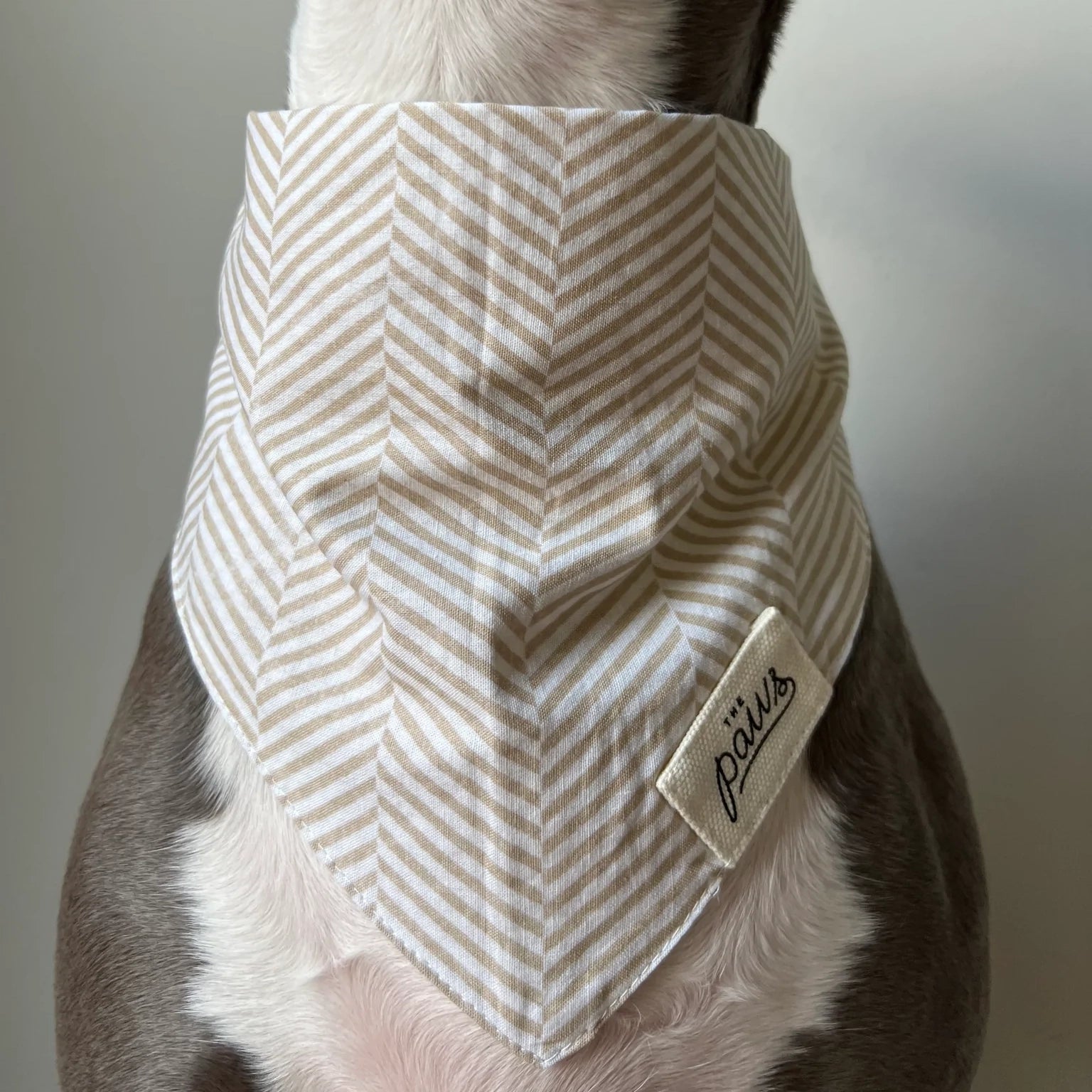 Herringbone - ein klassisches Design für Ihren Hund. Beige Streifen auf weißer Baumwolle, maßgeschneidert, in der Größe angepasst und fertig zum Tragen. Diese Halstücher sind eine schnelle und einfache Möglichkeit, den Tag Ihres Hundes mit Spaß und Stil zu bereichern. Es eignet sich perfekt für alle Gelegenheiten, sei es eine Geburtstagsfeier, ein Treffen mit anderen Hunden in einem hundefreundlichen Café oder ein Wochenende in einem haustierfreundlichen Urlaub.
