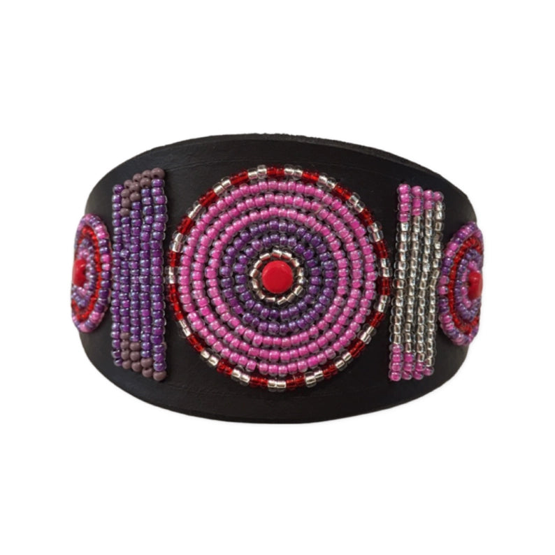 Das hochwertige Leder stammt von einem kenianischen Gerber. Die Messingschnallen werden in Kenia handgefertigt und das aus recyceltem Messing. Die Perlen werden von Hand direkt auf das Leder genäht. Jeder Bezug auf die gleichen Farbkombinationen, nur die Muster ändern sich je nach Lust und Laune der Mama's.