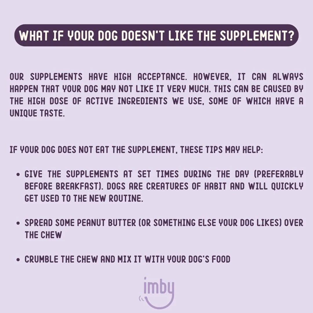 Imby's Hip & Joint supplement will support your dog's joint health and will increase mobility & flexibility. It provides a significant improvement in vitality and will strengthen the joints.